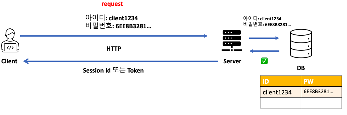 클라이언트인 사용자가 아이디와 비밀번호를 입력하고 데이터베이스에 일치하는 데이터가 있다면 인증(Authentication)에 성공한 것이다.