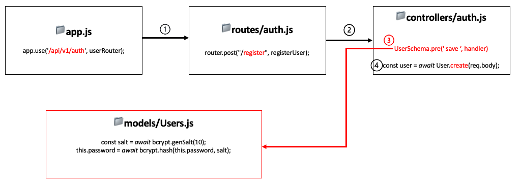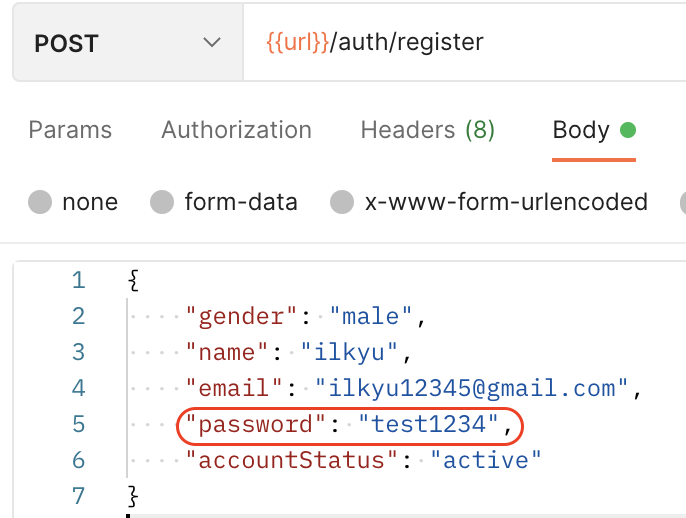 1. 클라인언트가 회원가입을 위해 정보를 입력하면 라우터를 통해 http://localhost:3000/api/v1/auth/register에 대한 경로로 들어옵니다.