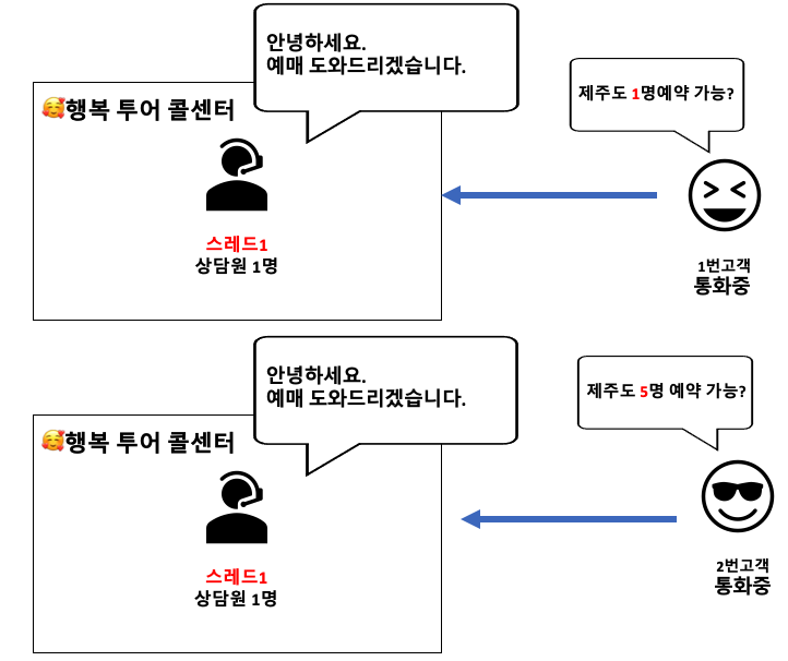 상담사는 한 명밖에 없기 때문에 먼저 걸려온 한 명에 고객 요청이 다 끝날 때까지, 나머지 사람들은 연결된 상태에서 대기해야 합니다.